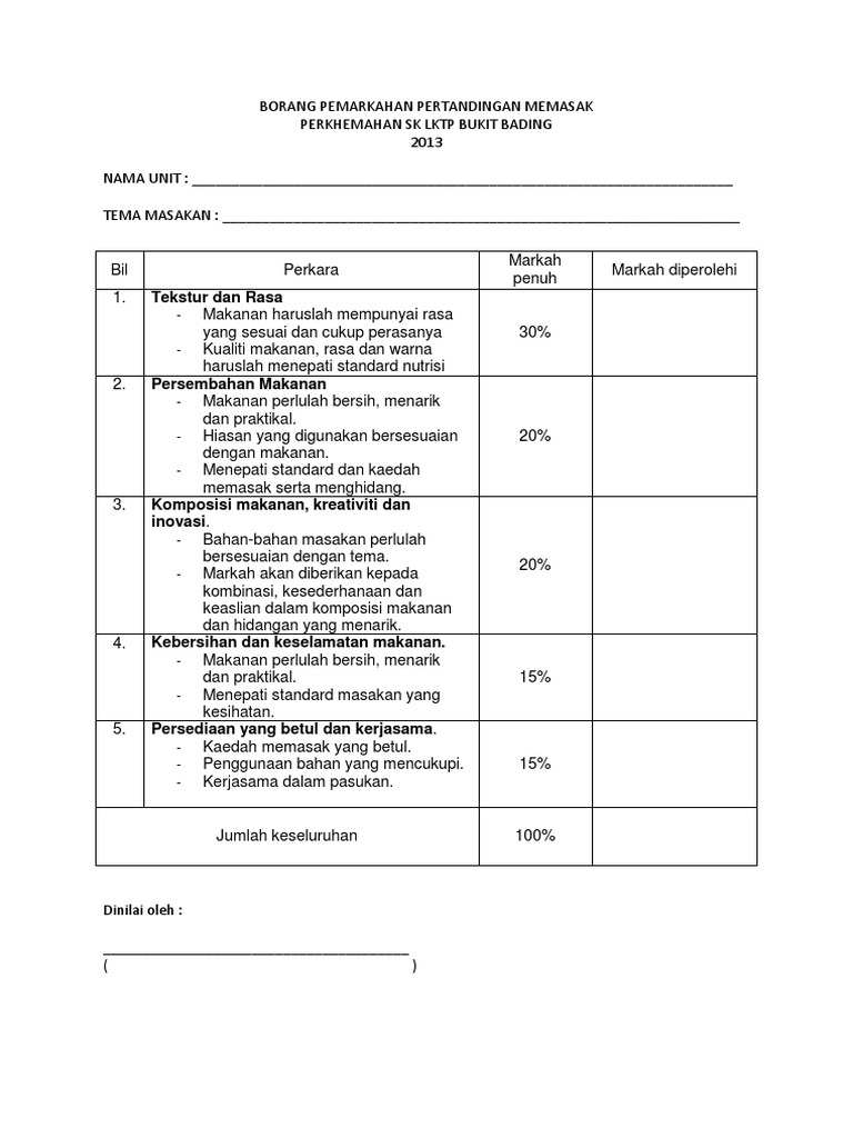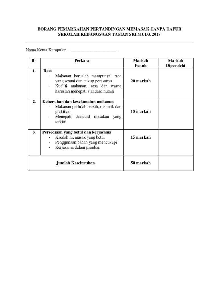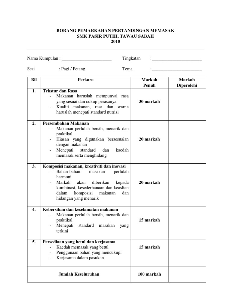 Borang Pemarkahan Pertandingan Memasak Pdf