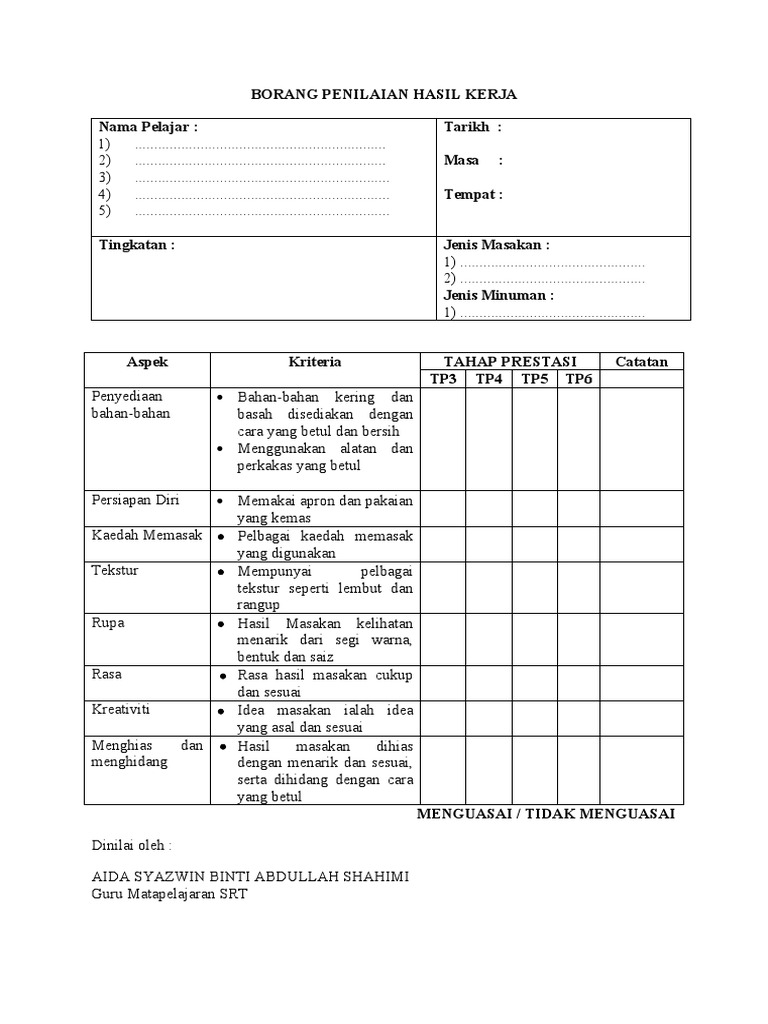 Borang Penilaian Hasil Kerja Masakan Pdf