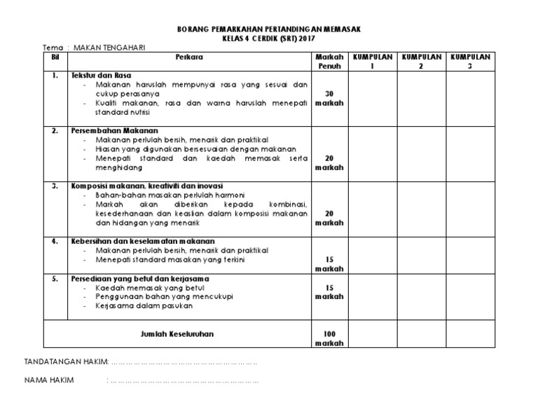 Home Unlabelled Kriteria Pemarkahan Pertandingan Mewarna Kanak-Kanak. View BORANG_PEMARKAHAN_PENILAIAN_1__2 from COMPUTER MPU 3113 at Tunku Abdul Rahman University College. Masakan yang dipilih 6 jenis haruslah seperti berikut.